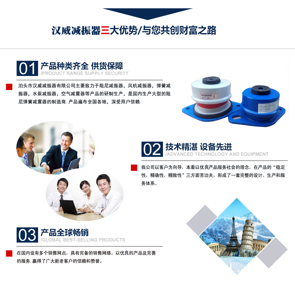 ?泊頭市漢威減振器有限公司主要致力于阻尼減振器,風(fēng)機減振器,彈簧減振器,水泵減振器,空氣減震器等產(chǎn)品的研制生產(chǎn),是國內(nèi)生產(chǎn)阻尼彈簧減震器的制造商,產(chǎn)品廣泛用于中央空調(diào)、通風(fēng)管道、鋼鐵、發(fā)電、石化、水泥和城市供熱等行業(yè)的各類管道和設(shè)備上,并在全國多地工程上得到應(yīng)用,業(yè)績遍布全國多地,深受用戶信賴. 公司主要減振器系列產(chǎn)品有:中央空調(diào)系列減振器、泵房系列減振器、管道系列減振器、風(fēng)機系列減振器、以及自行設(shè)計制作的系列隔振臺座。泊頭市漢威減震器科技有限公司擁有多名高素質(zhì)技術(shù)人員,擁有完善的阻尼彈簧減震器生產(chǎn)和檢驗專用設(shè)備,擁有硅橡膠自動擠出生產(chǎn)線,全自動彈簧機等設(shè)備。生產(chǎn)條件逐漸完善進步,努力擴大生產(chǎn)規(guī)模,提高泊頭市減震器科技有限公司的生產(chǎn)競爭力。 多年來漢威減振器以三誠作為公司的字號,旨在立足當(dāng)前......